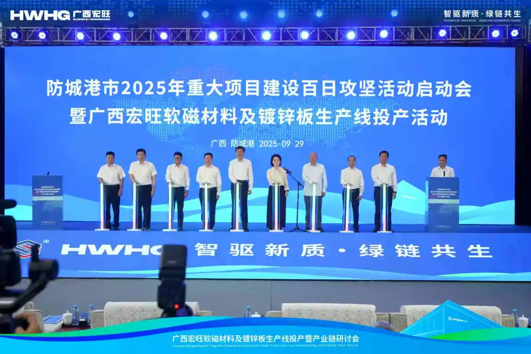 9月29日,廣西宏旺軟磁材料及鍍鋅板生產(chǎn)線投產(chǎn)活動隆重舉行。自治區(qū)黨委常委、自治區(qū)常務(wù)副主席許永錁出席活動,防城港市委書記黃江,市長邱明宏,市政協(xié)主席梁宗勇,自治區(qū)地質(zhì)礦產(chǎn)勘查開發(fā)局局長、自治區(qū)實體經(jīng)濟(jì)服務(wù)員工作隊駐防城港市工作隊隊長黎四龍,湖南省婁底市政協(xié)主席梁立堅,自治區(qū)發(fā)改委、工信廳、園區(qū)辦、防城港市四家班子及相關(guān)單位負(fù)責(zé)同志,行業(yè)協(xié)會專家、各金融機(jī)構(gòu)、各戰(zhàn)略合作單位,以及項目合作股東廣西盛隆冶金有限公司總經(jīng)理柯雪利、經(jīng)營總裁林能鏡,宏旺控股集團(tuán)董事長、總裁戴促輝,集團(tuán)副總裁朱繼喬、高志策、劉慧丹等領(lǐng)導(dǎo)嘉賓共同參與本次活動。防城港市委常委、常務(wù)副市長陶德文主持儀式。
