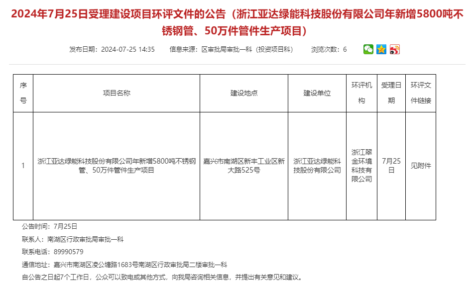 7月25日,浙江亞達綠能科技股份有限公司年新增5800噸不銹鋼管、50萬件管件生產(chǎn)項目環(huán)評文件獲受理,公告期:7個工作日。