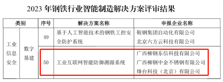 近期,在中國鋼鐵工業協會、鋼鐵行業智能制造聯盟共同開展的 “2023年鋼鐵行業智能制造解決方案及典型場景應用案例遂選”活動中,柳鋼東信公司“工業互聯網智能防御溯源”攻關方案入選2023年鋼鐵行業智能制造解決方案名冊。