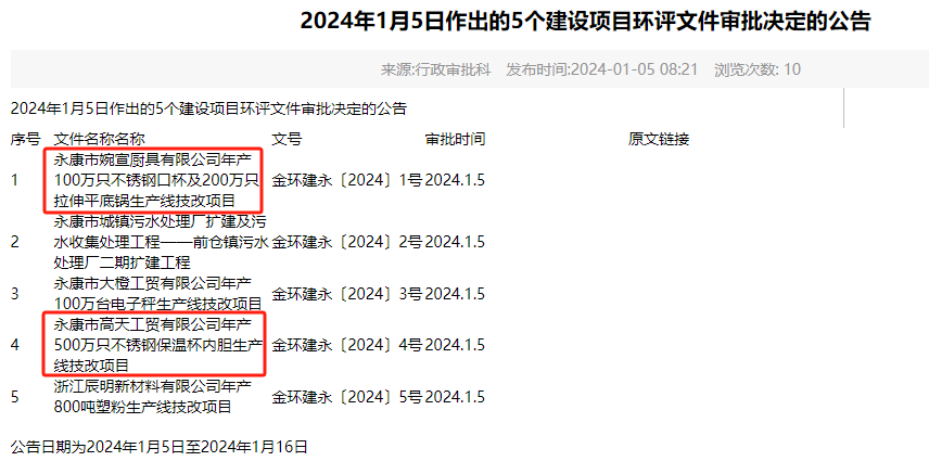 據(jù)顯示,涉及不銹鋼項(xiàng)目有2個(gè),分別為:永康市婉宣廚具有限公司年產(chǎn)100萬只不銹鋼口杯及200萬只拉伸平底鍋生產(chǎn)線技改項(xiàng)目、永康市高天工貿(mào)有限公司年產(chǎn)500萬只不銹鋼保溫杯內(nèi)膽生產(chǎn)線技改項(xiàng)目。