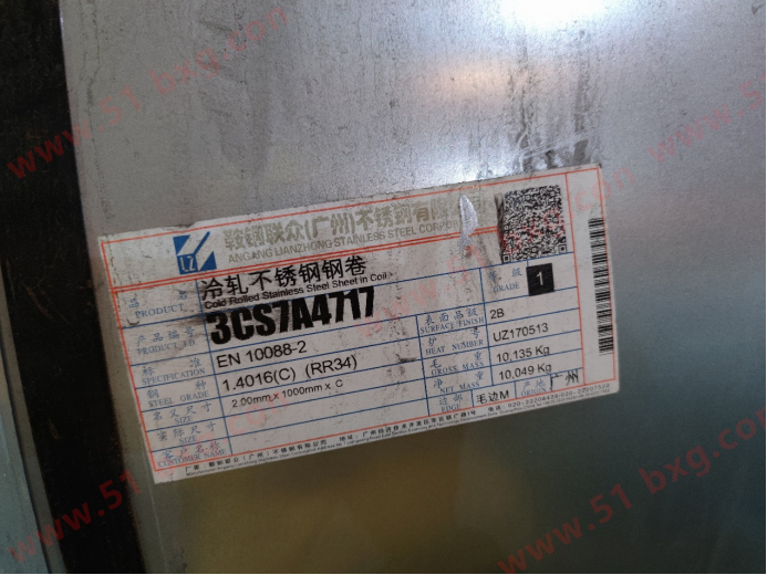 據(jù)本網(wǎng)跟進了解,此為鋼廠出口歐洲的430材料。在產(chǎn)品標簽的標準一欄也是寫了EN 10088-2字樣。